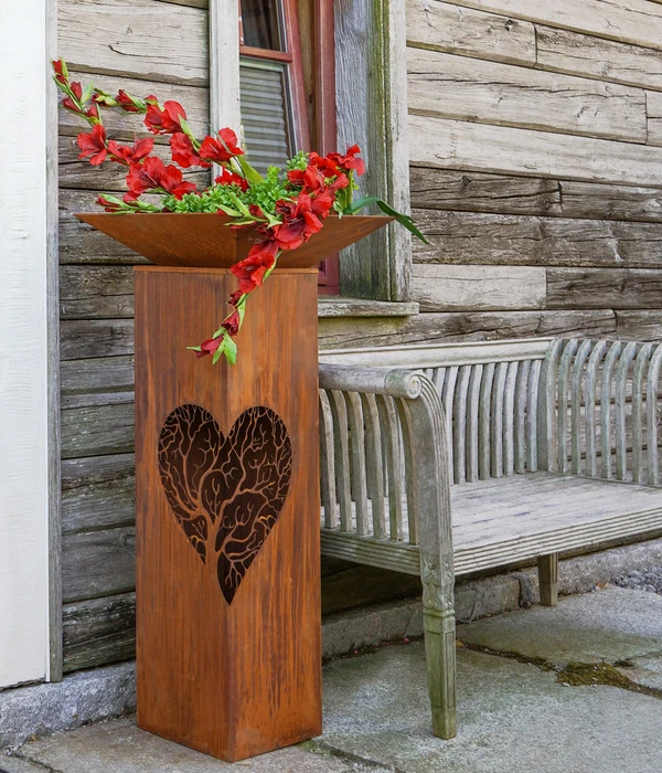 Sie setzen bei Ihren Dekorationen auf exquisite Objekte? Dann ist die Metall-Säule Lebensader von Badeko wie für Sie gemacht. Das edle Dekoelement besticht durch eine wunderschön gearbeitete Baumsilhouette in Form eines filigran ausgeschnittenen Herzens. Die kleinen Zweige wirken sehr lebendig und machen die hübsche Säule zu etwas ganz Besonderem. Hinzu kommt die reizende Edelrost-Optik, die mit ihrer warmen Farbgebung überzeugt. Wenn Sie Ihren Eingangsbereich oder den Garten noch gemütlicher gestalten wollen, dann empfiehlt es sich, das Dekoobjekt im Inneren mit einer LED-Kette zu beleuchten.