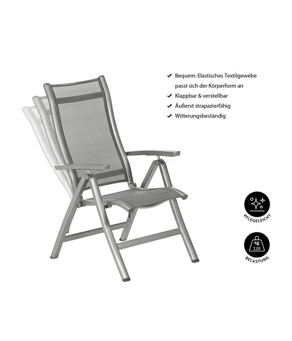 Auch das Thema Komfort wird beim Dehner Klappsessel Chicago groß geschrieben. Denn dafür wurde er nicht nur mit einer verstellbaren Rückenlehne ausgestattet, mit der Sie sich stets die individuell passende Neigung einstellen können. Seine Rückenlehne besitzt außerdem eine ergonomische Form, die für gesunde Bequemlichkeit sorgt. Und damit noch immer nicht genug. Denn die hochwertige Textilene-Bespannung passt sich beim Sitzen angenehm an Ihren Körper an, um sich nach Gebrauch wieder in ihre Ursprungsform zurück zu bewegen. Das klingt nicht nur nach herrlich viel Bequemlichkeit, das ist es auch!